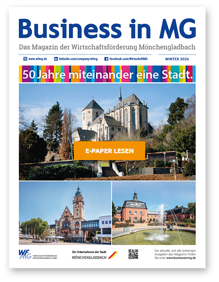 Stets aktuell informiert: Viermal jährlich fasst das WFMG-Magazin „Business in MG“ die neuesten Entwicklungen rund um den Wirtschafts- und Immobilienstandort Mönchengladbach zusammen. Angefangen bei interessanten Großprojekten der Stadt über Büro- und Gewerbeflächenentwicklungen bis hin zu Veranstaltungs- und Unternehmensnachrichten bietet das Magazin Entscheidern aus der städtischen Unternehmerschaft, Politik und Verwaltung die Möglichkeit, sich schnell über das Geschehen in unserer Stadt zu informieren.