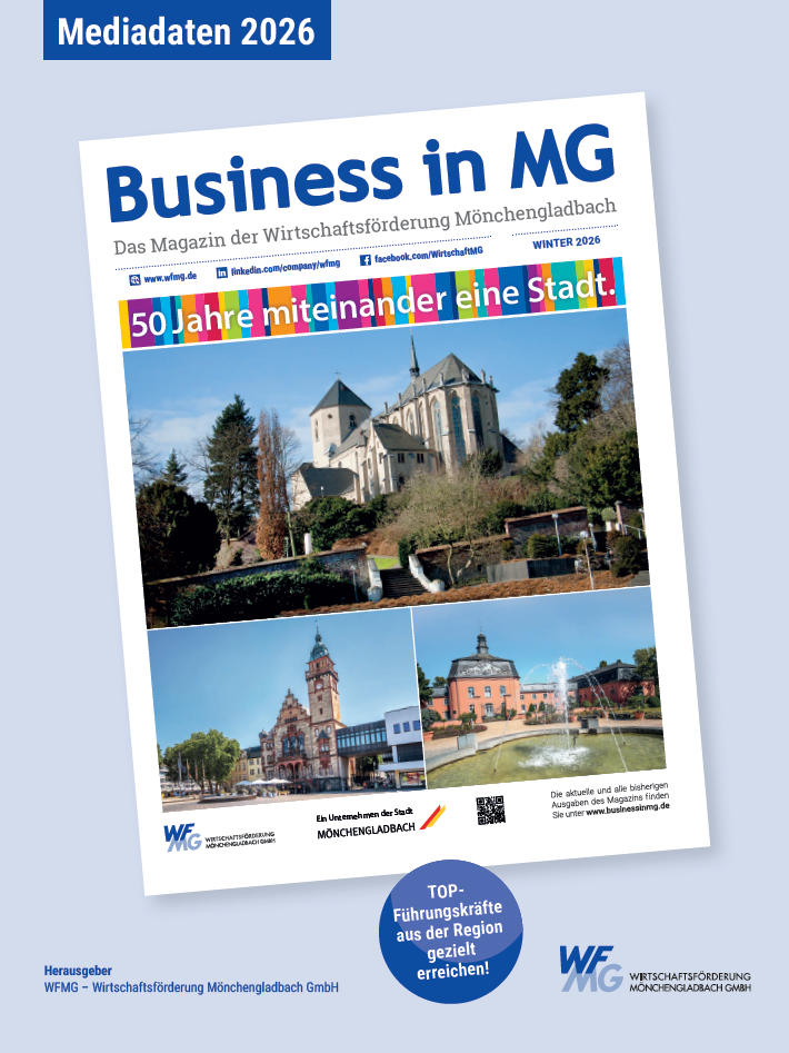 Die „Business in MG“ ist der Umschlagplatz für relevante Wirtschaftsthemen aus Mönchengladbach. Damit bietet sie auch Werbetreibenden eine interessante Plattform, um in einem ansprechenden B-2-B-Umfeld die Entscheider in der Stadt direkt anzusprechen. Nähere Informationen zur Anzeigenschaltung entnehmen Sie bitte den Mediadaten. Umsetzungspartner ist unsere Agentur Jüngermann & Werner.