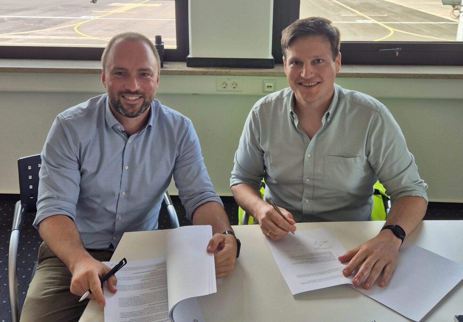 (2) Andreas Ungar (l.), Geschäftsführer des Flughafens Mönchengladbach, mit Christopher Mihm, Geschäftsführer von Thrustworks, bei der Unterzeichnung des Mietvertrags.